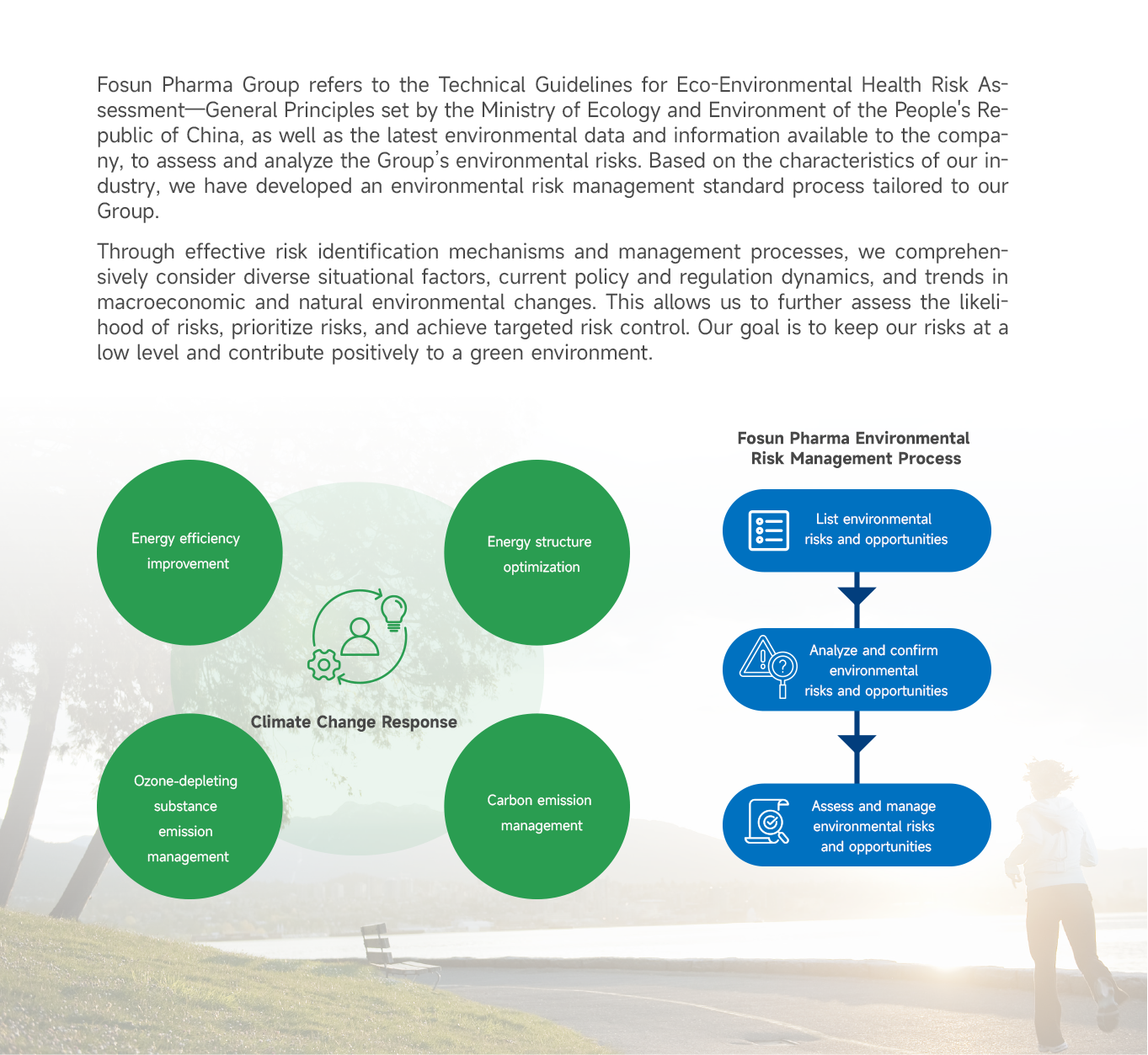 The Board is the highest authority within Fosun Pharma for the topics of "Climate Change Response" and "Environmental Management", with the ESG management system fully responsible for the supervision, decision-making, management, and implementation of relevant initiatives. Furthermore, the Group has incorporated objectives and indicators related to "Climate Change Response" and "Environmental Management" into the performance evaluation frameworks for senior management, with a weight of no less than 5%.
