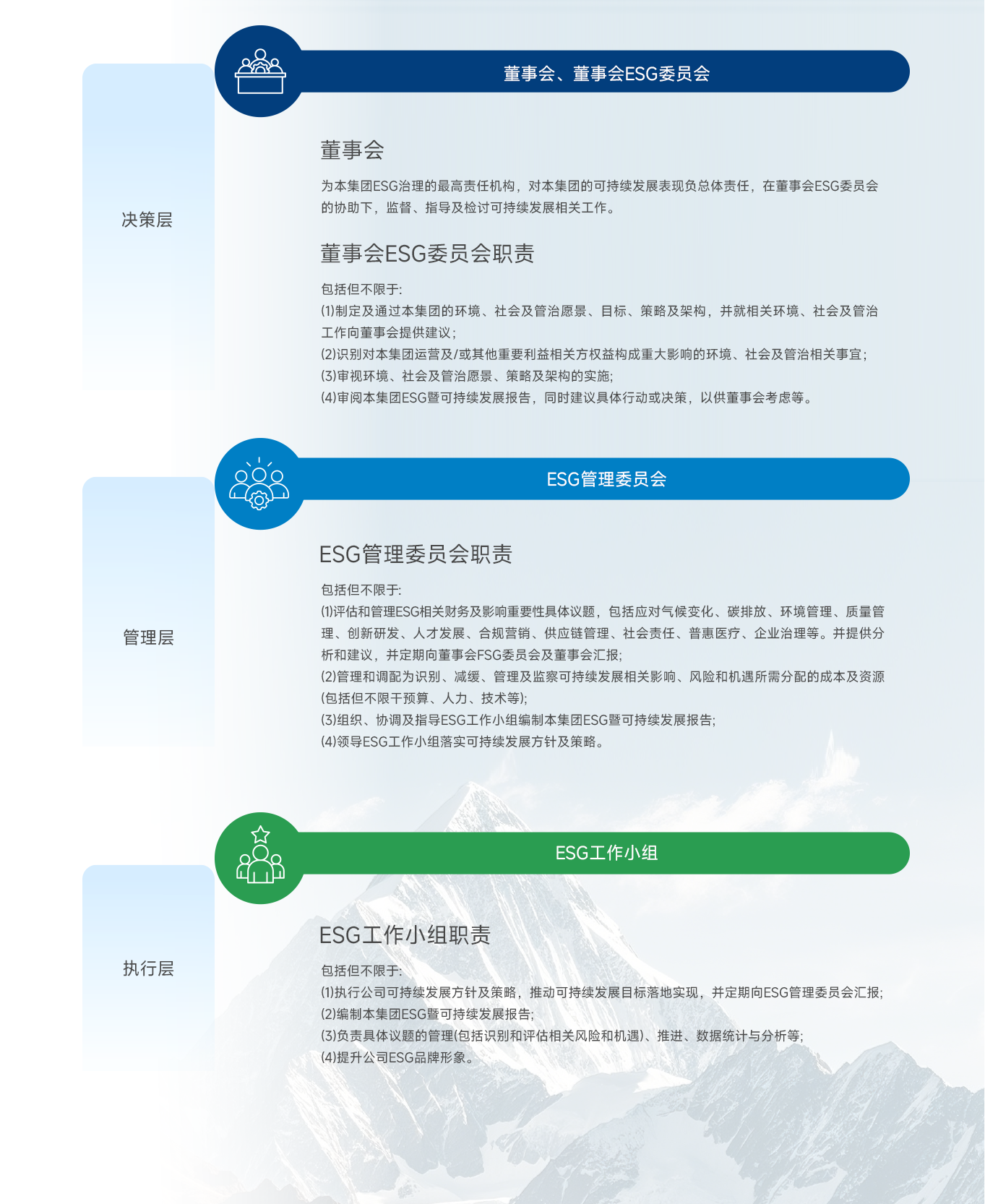 恒峰国际医药集团构建了由董事会及董事会ESG委员会、ESG管理委员会、ESG工作小组组成的ESG治理架构,以确保董事会及管理层对可持续发展的有效监管、科学指导及全力支持。
