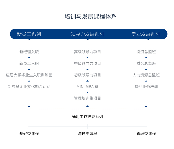 依託公司的企業文化,我們持續開展四大系列的培訓項目,即「新員工系列 」、「領導力發展系列 」、「專業發展系列」和「通用職業技能系列」。